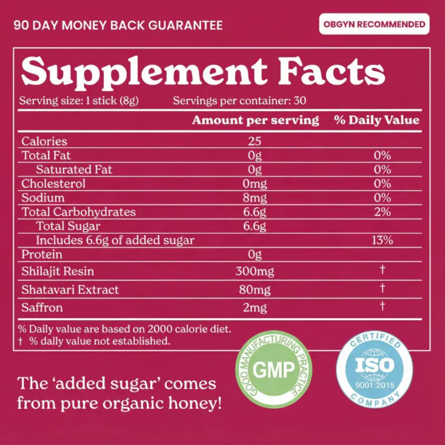 I've heard Shilajit is disgusting.Pure Shilajit resin straight from the jar? Yes — earthy, bitter, and smoky. She-Lajit is nothing like that. The raw honey and strawberry flavor completely transform the experience into something you actually look forward to. If you want an even smoother texture squeeze your stick into warm water or tea and it melts right in — most women say it tastes like a honey drink.